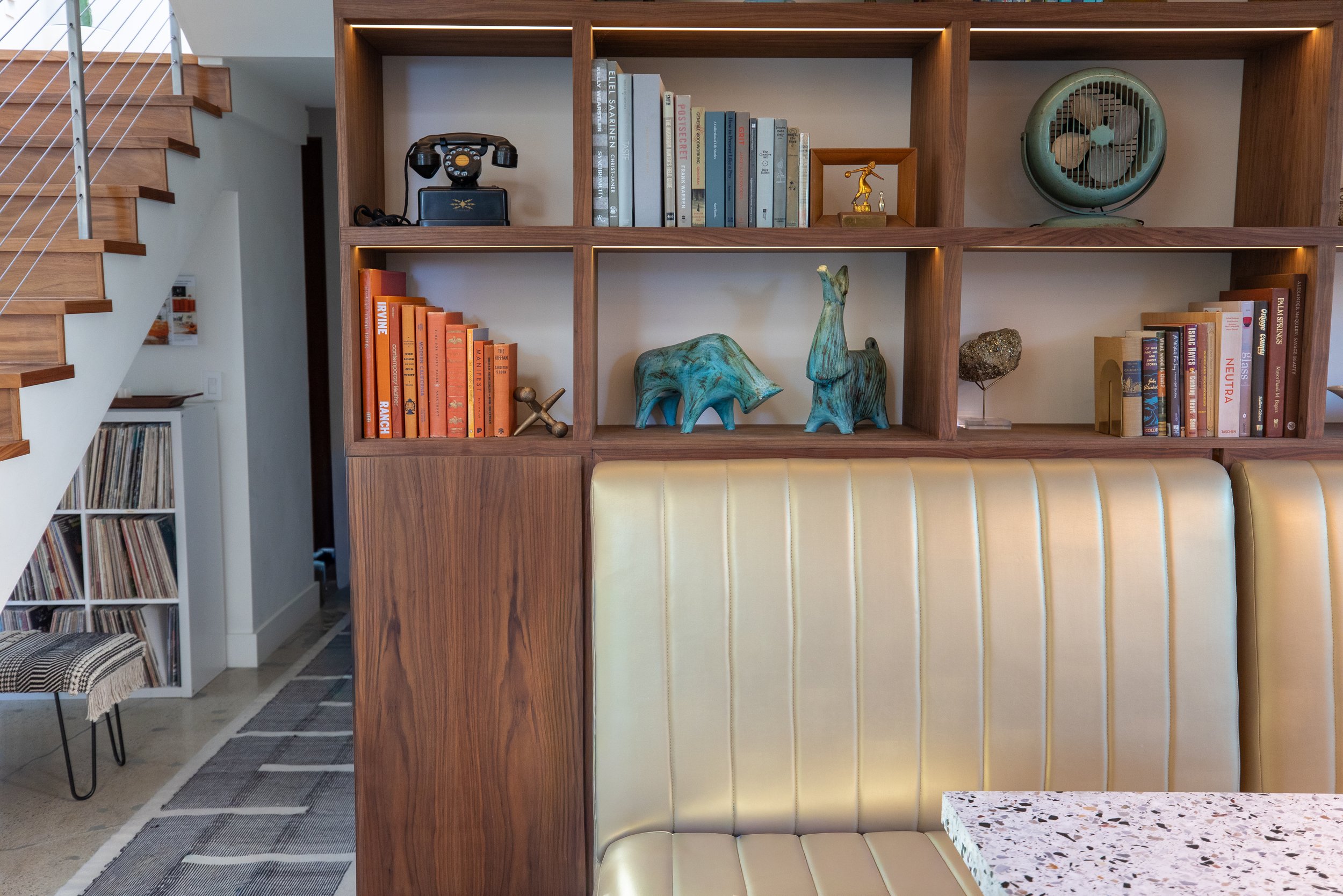 The solution was a dramatic dining feature: three upholstered booths built directly into an oversized custom bookshelf. This expansive wall of display allows the family’s collection to be showcased while simultaneously creating an intimate dining environment. At its center sits a custom-designed table featuring a terrazzo slab top and welded steel base, comfortably seating twelve and anchoring the room as a true gathering place.